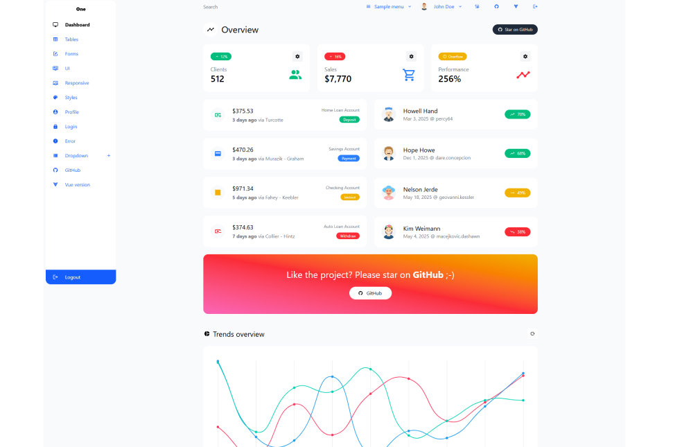Admin One React Tailwind is a modern, fast, and visually appealing admin dashboard template. Built with React, Tailwind CSS 3.x, TypeScript, and Next.js, it offers a clean, dark mode interface that's perfect for creating admin panels and dashboards. Its lightweight design ensures smooth performance without sacrificing functionality.