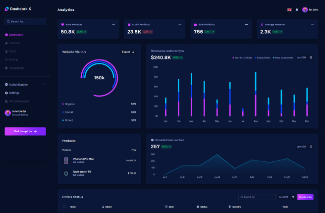 DashDarkX is a modern admin dashboard template designed with Material-UI. Created by Malik Ali for the Figma Design Community, this dark-mode theme enhances user experience and offers seamless navigation with pre-built components.