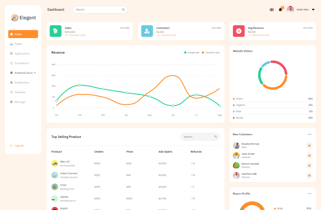 Elegant is a React-based admin dashboard template designed by Malik Ali for the Figma Design Community. It is a free template that includes a clean and minimal design developed by ThemeWagon. The template integrates 3 authentication pages and multilingual support, allowing the page to be translated into 6 different languages. This fresh and simple layout offers a smooth navigation experience and is perfect for developers looking for a flexible, responsive design.