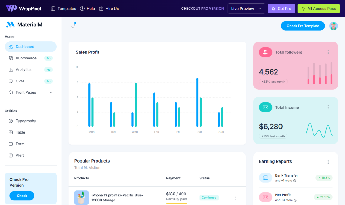 MaterialM Free Tailwind React Admin Template is a modern open-source React dashboard that has been built with Next.js, Tailwind CSS, Flowbite-React, TypeScript, and ApexCharts. It is based on Google's Material Design 3, which provides proper responsiveness and a clean interface, making it an ideal dashboard for SaaS platforms, as well as an admin panel for system controllers, business dashboards, and internal tools. This developer-friendly template has been designed for optimal performance, adherence to SEO best practices, customization, and is available for both personal and commercial use under an MIT license. MaterialM is feature-rich and has a fully responsive dashboard that can be created in customizable ways by combining utility-first styling with a modular codebase approach. It has the necessary pages, charts, and components that make your dashboards functional and production-ready right out of the box, which is perfect for speeding up development timelines.
