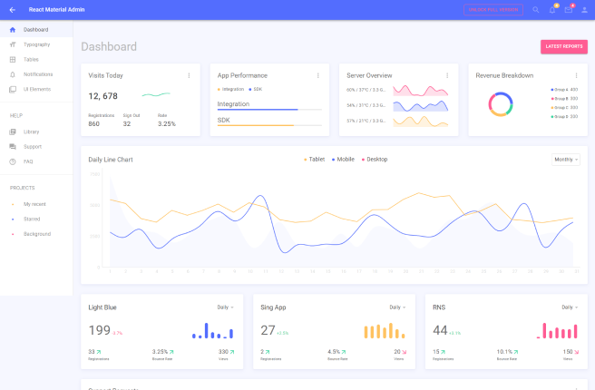 React Material Admin Full is a robust and customizable React admin dashboard template built using Material-UI and React Hooks, offering a seamless experience for building business applications like e-commerce dashboards, CRM systems, project management tools, and more.