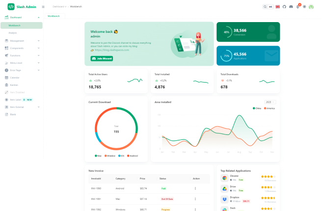 The Slash Admin is a modern admin dashboard template built using cutting-edge technologies like React, Vite, Ant Design, and TypeScript. It is designed for developers looking to create powerful admin management systems quickly and efficiently.Slash Admin is a complete toolkit for developers to build high-performance web apps. With responsive design and customizable features, it simplifies admin interface creation while ensuring efficient project management and top-notch code quality.