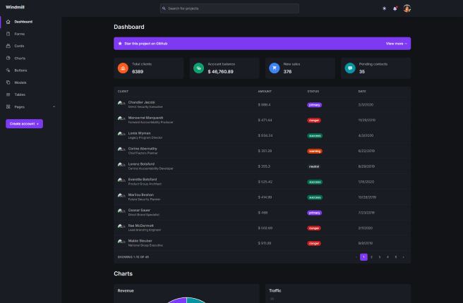 Windmill Dashboard React is a complete admin dashboard built with React, offering excellent accessibility features. This dashboard is designed with a dark theme, 100% keyboard navigation, and accessibility for screen readers, ensuring a user-friendly experience. The layout is fully customizable and responsive, making it suitable for a variety of web projects, from e-commerce platforms to data management systems.